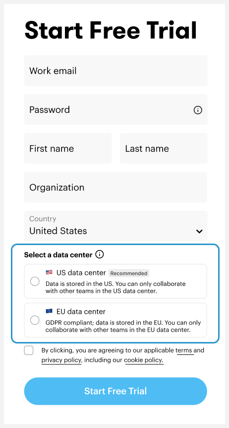 You can host your data in either the United States (Virginia) or the European Union (Germany), no matter where you live or do business. When you sign up for a free trial or purchase a subscription online, select a data center location—U.S. or EU—as shown below.