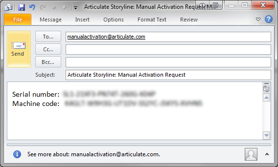 A new email message should open in your default email program. Just click Send and proceed to step 3 below.However, if a new email message doesn't appear, create a new email message in your email app and address it to manualactivation@articulate.com. Then copy the serial number and machine code from the activation form above, and paste them into the body of your email.