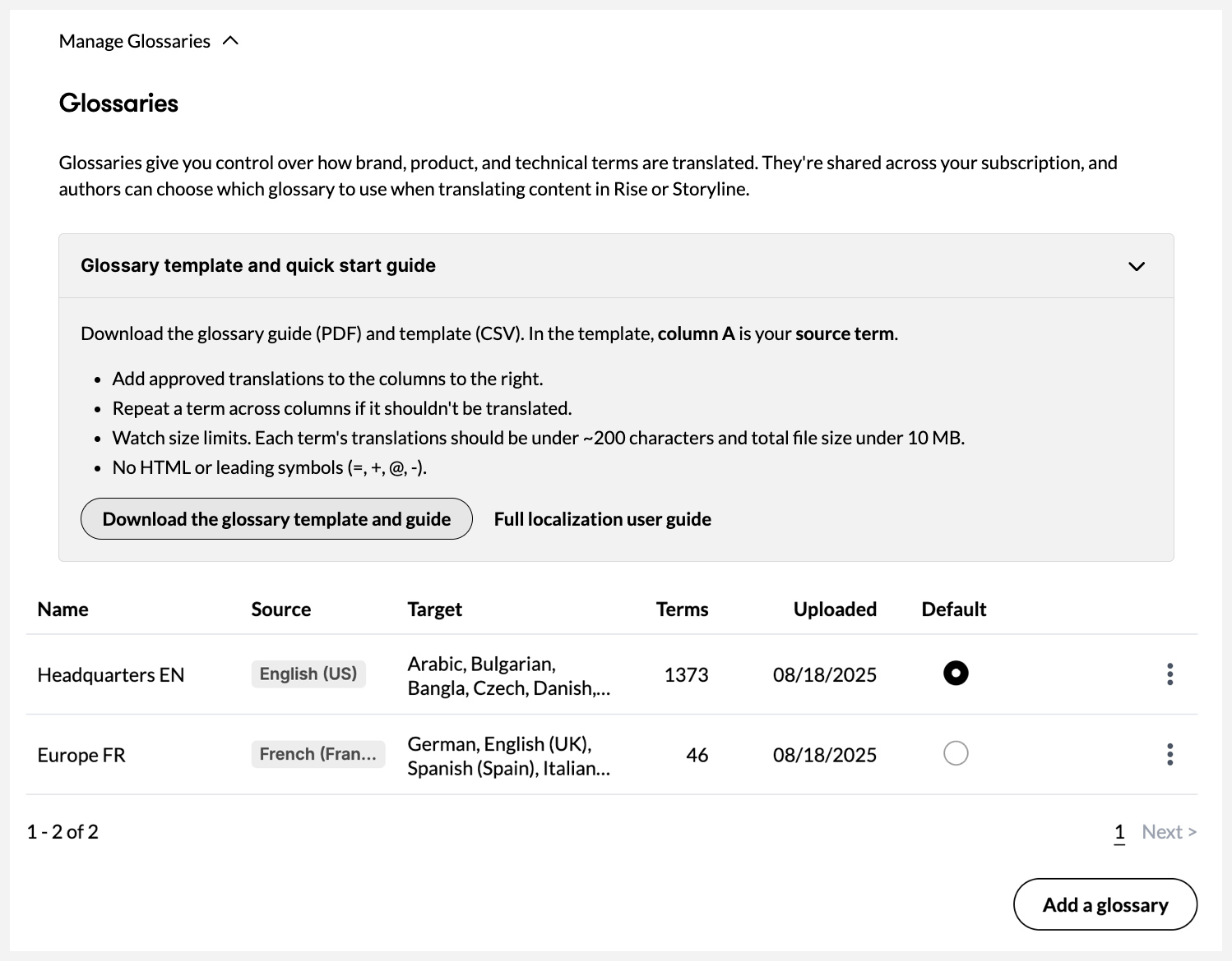 Up to 15 separate glossaries may be shared across your subscription. When translating content in Rise 360 or Storyline 360, authors can choose which glossary to use for a specific translation run. Keep reading to learn how to use the glossaries feature.