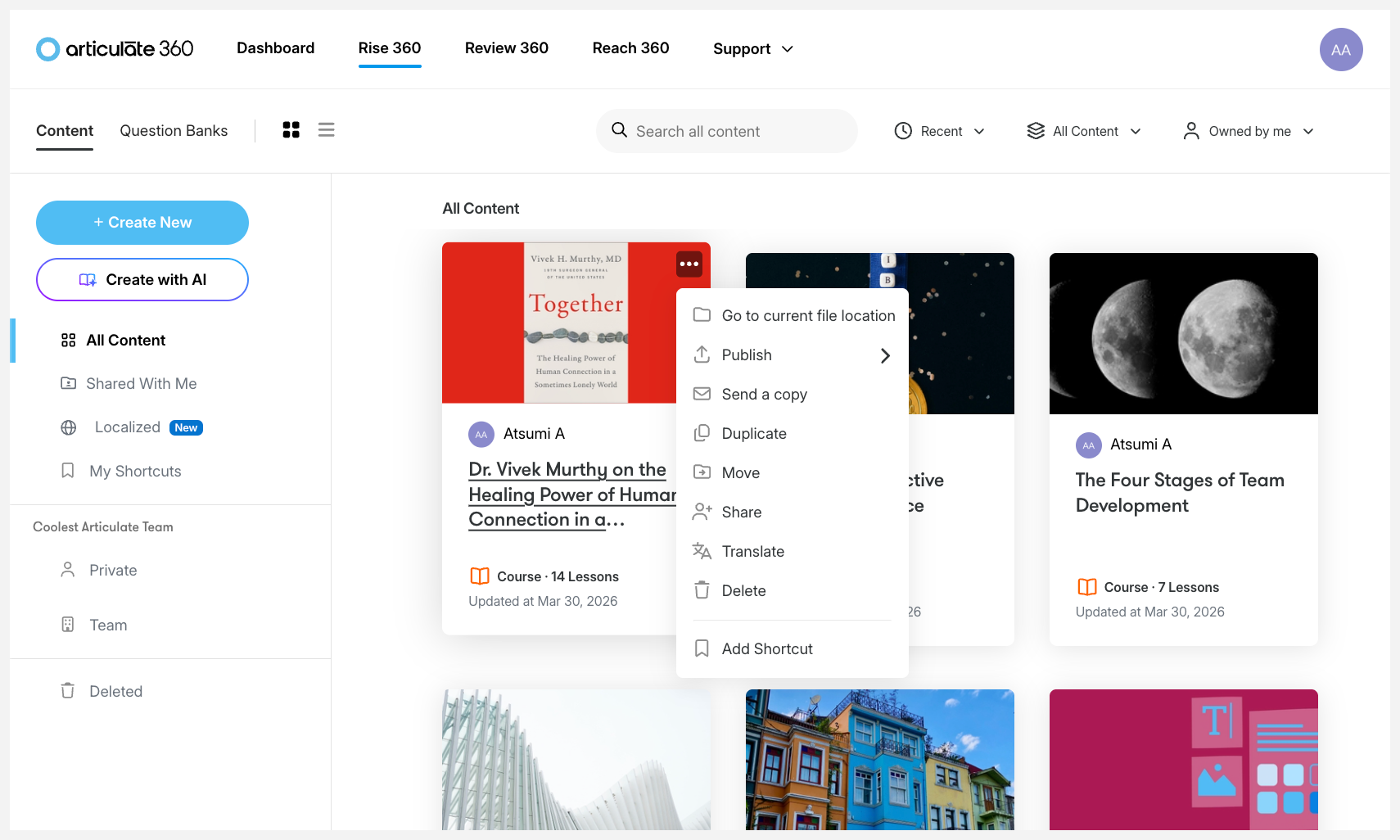 | Content Tiles | As you use Rise 360, a new tile appears for each piece of content you create.Each tile displays the cover photo, title, lesson count, and last modified date. Articulate 360 Teams subscribers who collaborate on content will also see the owner's profile icon on the course tile.Click a tile to open the content for editing and previewing. Hover over a tile, then click the ellipsis that appears to see options for managing the content.Tip: Collaborators' options depend on their role. Only course owners can delete content. Collaborators can remove themselves. Not every option appears for every piece of content. |