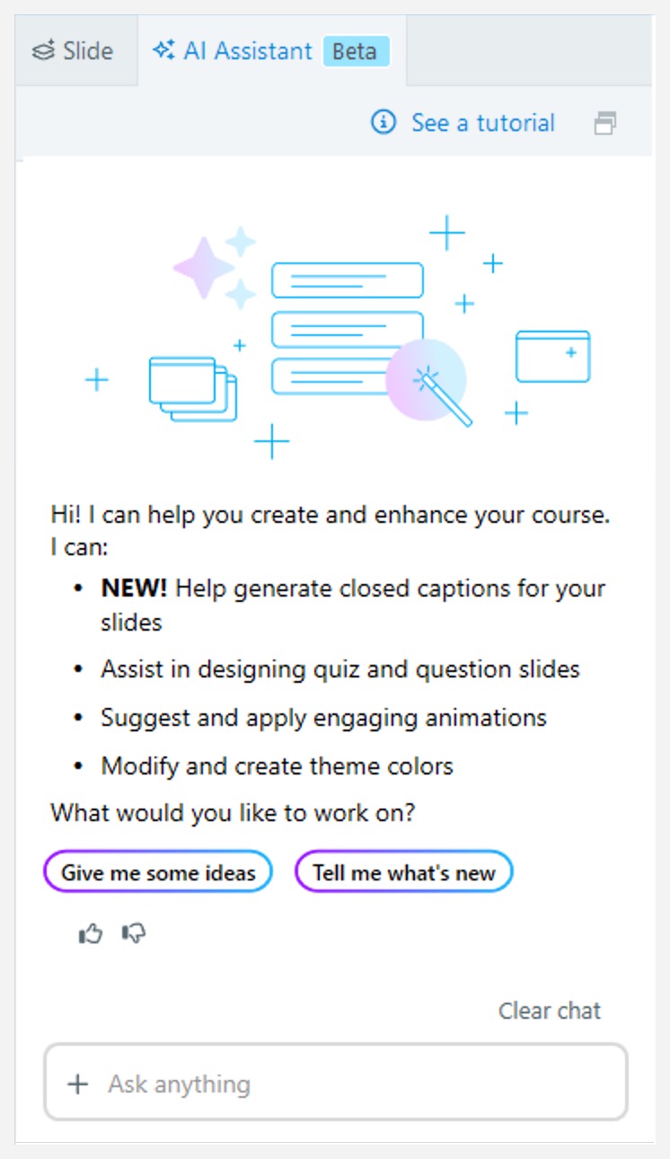AI Assistant is a set of generative AI tools integrated into Storyline 360 to help you unlock creativity and develop high-quality e-learning content faster than ever. Compose compelling copy, generate custom imagery and realistic text-to-speech, and more from the easy-to-access ribbon—or jump straight into a chat with AI Assistant to get things done more efficiently. Ready to bring these AI superpowers into your workflow? Let’s get started!
