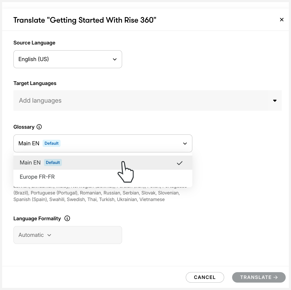 - Wählen Sie das richtige Glossar aus und klicken Sie auf Übersetzen.