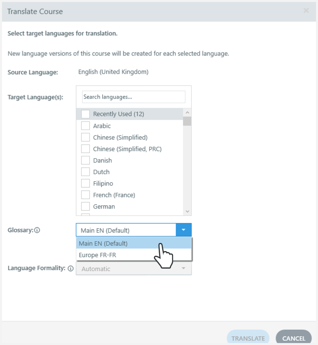 Wenn einem Abonnement mehrere Glossare hinzugefügt werden, können Autoren wählen, welches sie bei der ersten Übersetzung eines Kurses verwenden möchten. Dieses Glossar wird für alle zukünftigen Kursübersetzungen verwendet, einschließlich zusätzlicher Sprachen und Kursaktualisierungen.